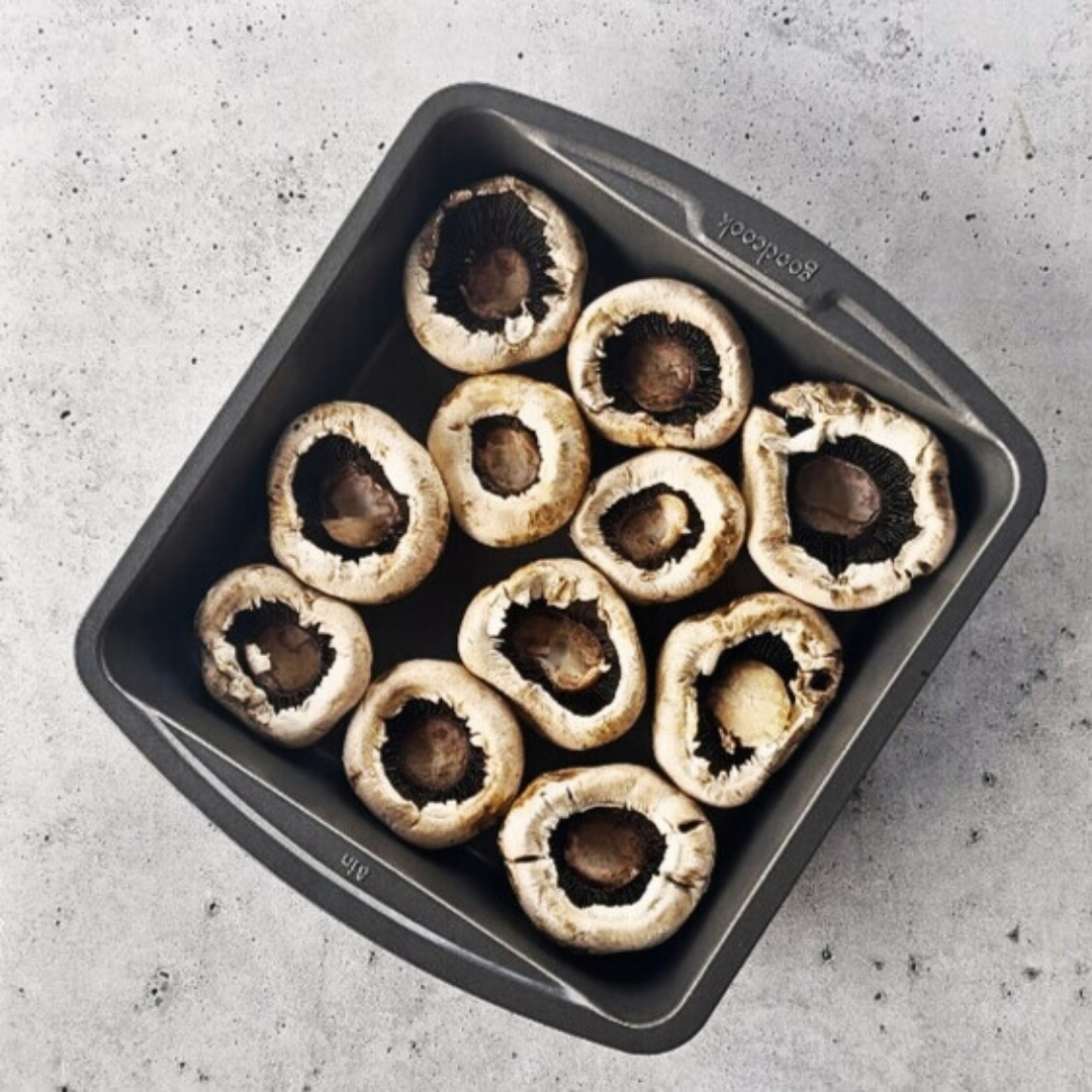 - Heat oven to 400°F. Clean mushrooms, remove stems, chop stems finely. We’re big fans of making use of every part of an ingredient, it feels like a good practice overall. So, keep those stems and make good use of the full mushroom.