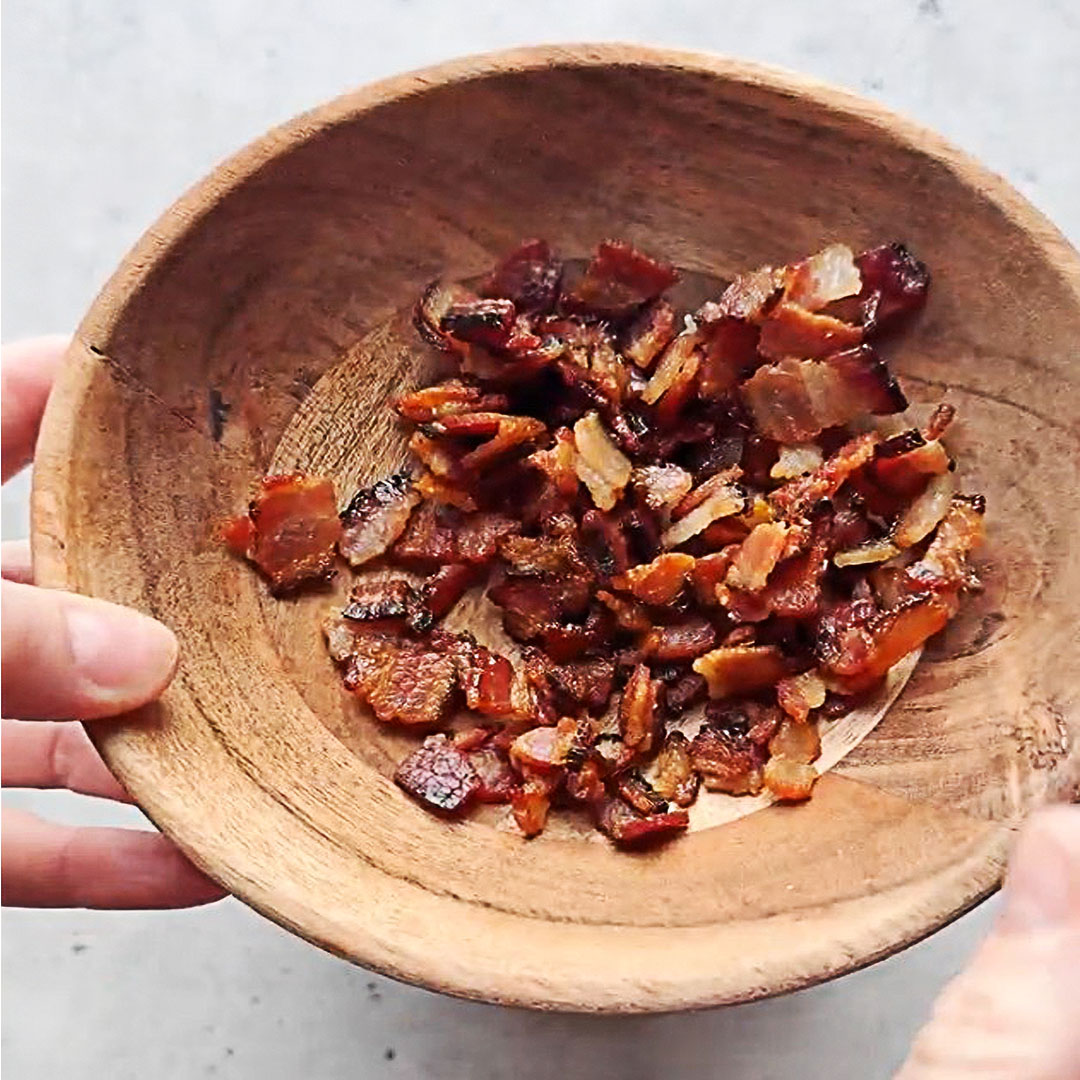- Cook the bacon: Place bacon in a cold skillet and bring to medium heat. Cook until crisp and deeply browned. Transfer to a paper towel–lined plate. Reserve 2–3 tablespoons of the rendered bacon fat. Once cooled, chop bacon into bite-size pieces.