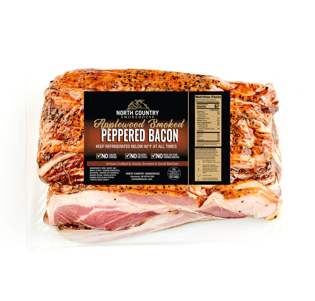 These maple-cured bacon slabs are rolled in cracked peppercorn and left to rest, absorbing the deep flavor of their earthy, spiced coating before they’re smoked. This careful process lends a wonderful contrast between the subtle sweetness of the syrup and the warm kick of smoky black pepper.