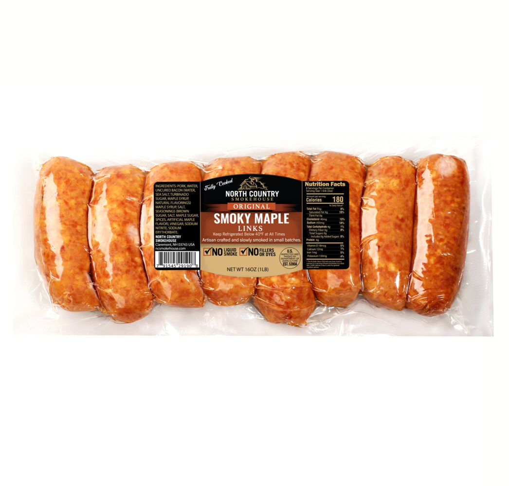 Our smokehouse sits in the middle of maple country, so years ago it made sense to craft this smoked breakfast favorite using pure, dark syrup from a nearby sugarmaker as a sweet marinade before we smoke them over applewood fires.